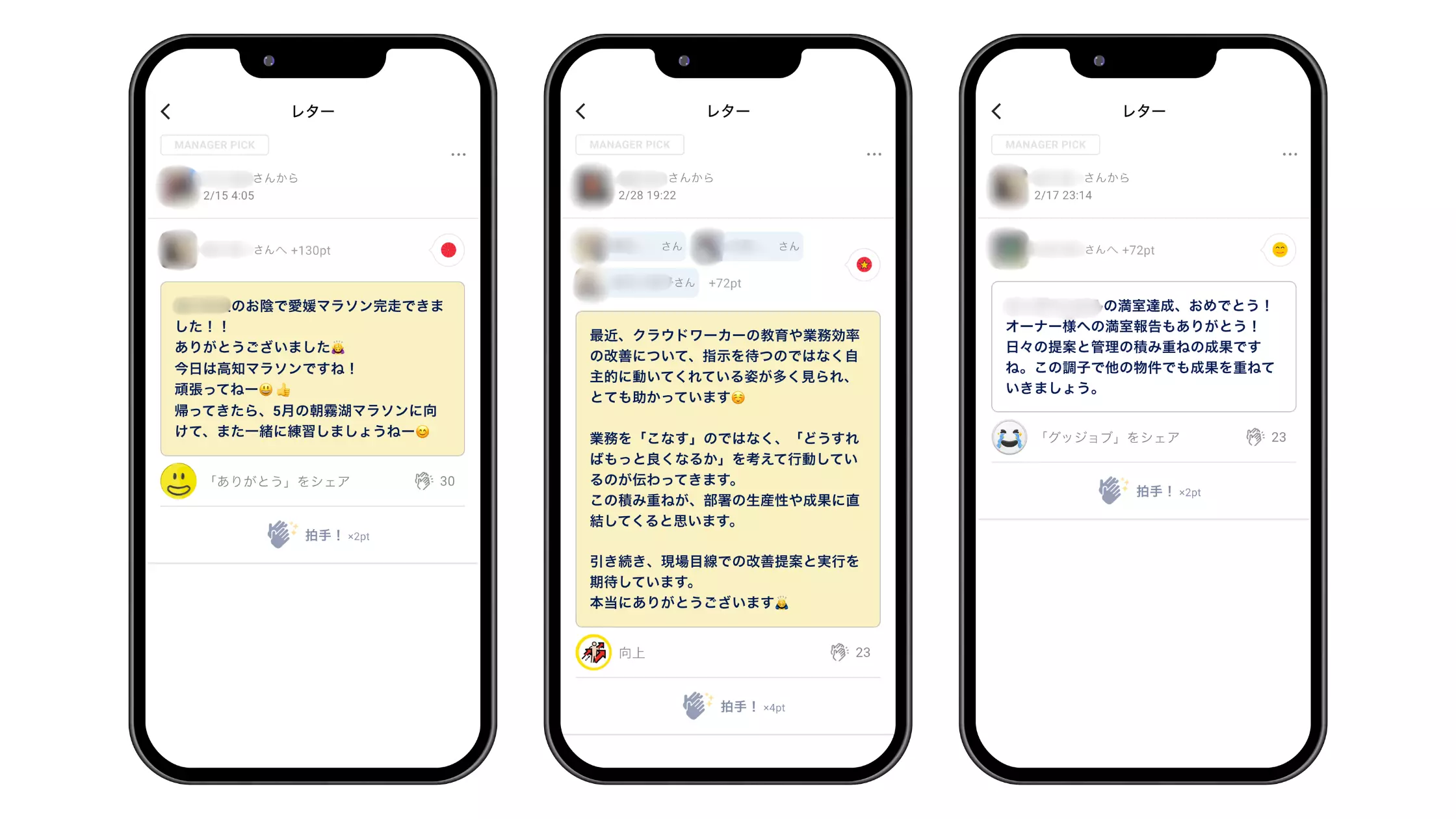 中矢様:先ほどもお伝えしたように、業種によってはシフトによって従業員同士が顔を合わせる機会がまったくないという場合もあります。しかし、顔を合わせることはなくても感謝する機会はあるはずです。他の人が感謝や称賛をしている内容を見ると「あの人はこんなに頑張っているのか」「自分もこういう行動をしてみよう」などと勉強になることもあるでしょう。